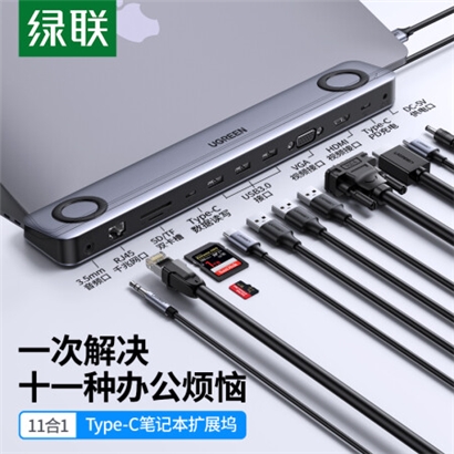 绿联 Type-C扩展坞 USB-C转HDMI投屏VGA拓展坞网线转接头3.5音频通用苹果MacBook笔记本转换器十一合一带供电 |