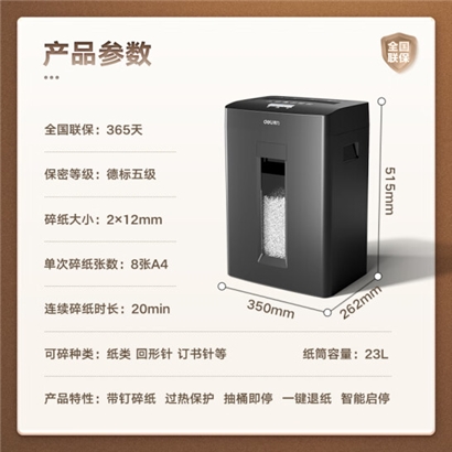 得力(deli)5级高保密商用办公碎纸机 文件粉碎机GA510( 连续碎纸20分钟 单次8张 23L)
