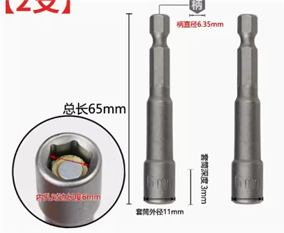 高硬度强磁套筒 电动气动批头六角柄起子头风批 6*65mm(个) |
