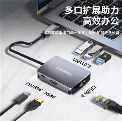 联想(Lenovo)Type-C扩展坞USB分线器转换HDMI转接拓展坞4K 60HZ投屏PD快充千兆网口苹果手机平板电脑通用 |