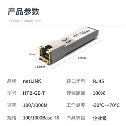 netLINK 光模块 SFP光模块 SFP光转电口模块 HTB-GE-T 千兆电口模块100米 1只 适配华三华为锐捷 |