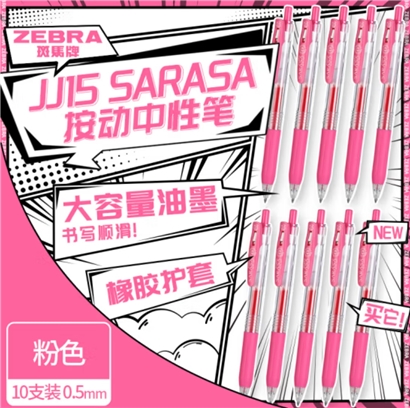斑马牌(ZEBRA)JJ15 按动中性笔 签字笔 0.5mm子弹头啫喱笔水笔 学生彩色手账笔 粉色 10支装 |