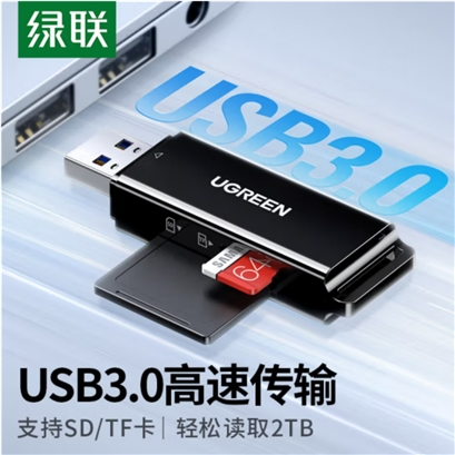 绿联(UGREEN)40750 USB3.0高速读卡器 SD/TF内存卡读卡器 支持相机单反手机电脑行车记录仪监控无人机储存卡读卡器 |