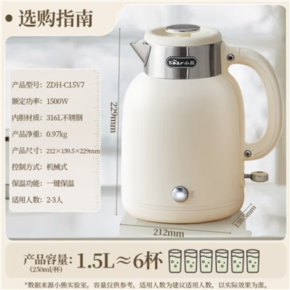 小熊 电水壶烧水壶电热水壶 1.5L恒温水壶双层防烫开水壶 316L无缝内胆热水壶 ZDH-C15V7 |